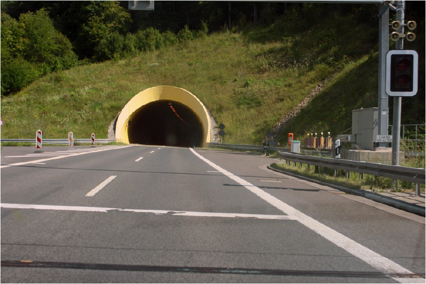 Der Meßwagen ein roter VW Caddy steht nicht sichtbar unter der Brücke. (5/6)